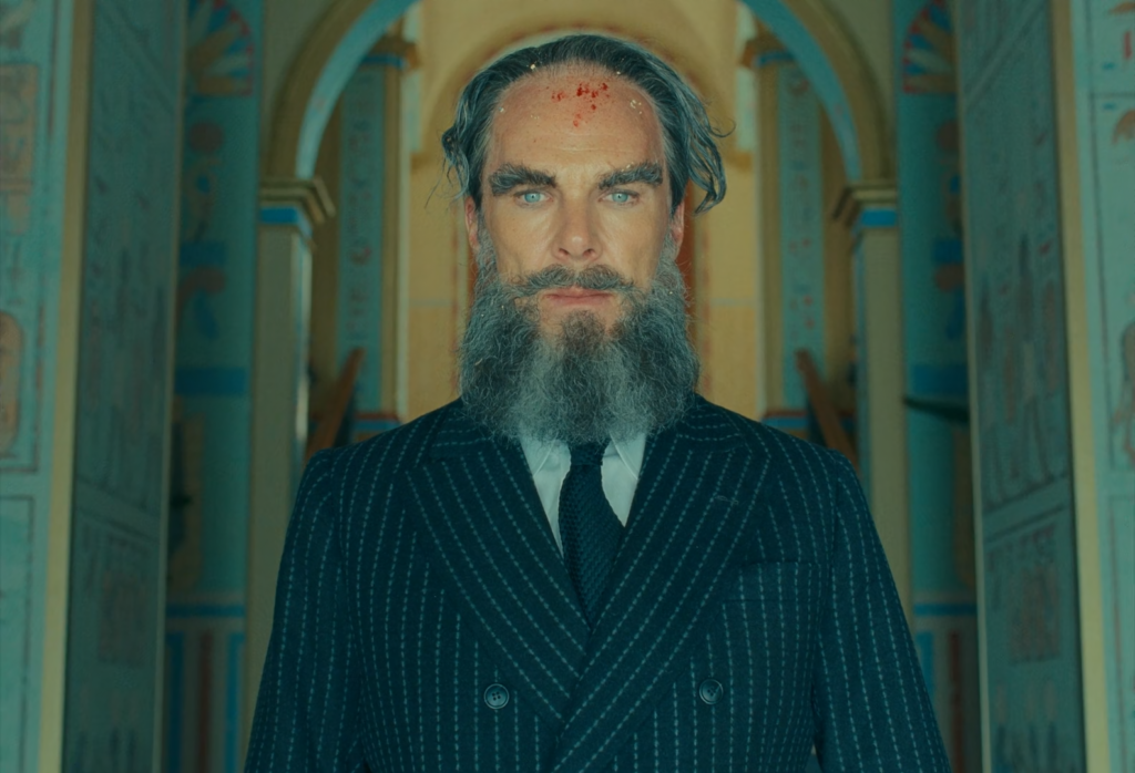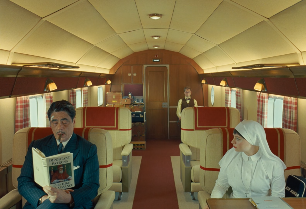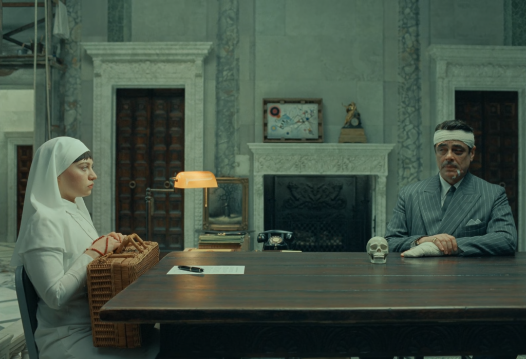 O que captura o olhar em The Phoenician Scheme antecede o estilo: é o corpo cansado de Zsa-zsa Korda. Ele atravessa os enquadramentos rígidos como alguém que já não cabe neles. Desde a primeira tentativa de assassinato, o filme se dedica a mostrar as consequências de um homem tentando impor ordem a um mundo que ele mesmo ajudou a deformar. A simetria permanece e os movimentos continuam calculados, mas o conforto desapareceu. Cada plano parece lutar contra o personagem que ocupa o centro.