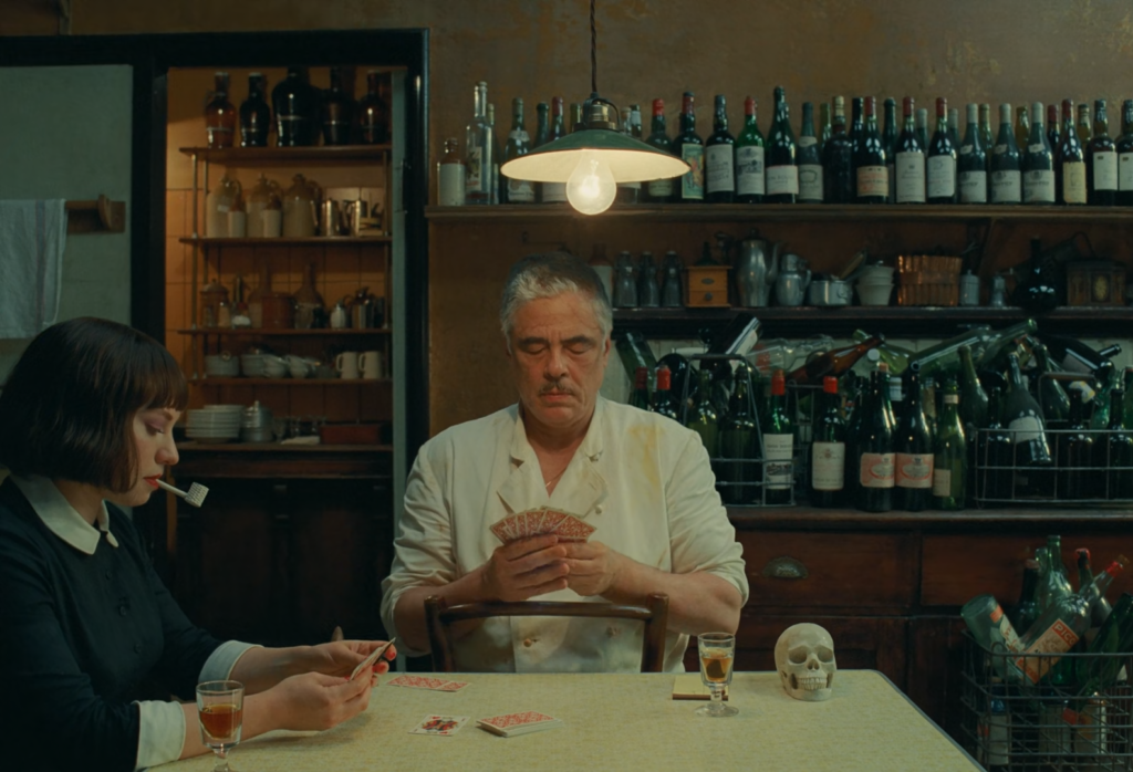 Resta saber se o estilo consegue ordenar um mundo que nasceu torto. Anderson enquadra os encontros entre pai e filha de maneira quase ritualística, onde o silêncio pesa mais que o afeto e a relação passa longe de qualquer lição familiar. O convento que moldou Liesel revela-se apenas outro sistema de regras rígidas, equivalente ao do pai. A câmera observa sem absolver. Ambos os espaços — o crime organizado e a vida monástica — operam sob a ilusão de que rituais estritos podem conter a natureza humana, mas o filme expõe a falência dessa teologia do controle.